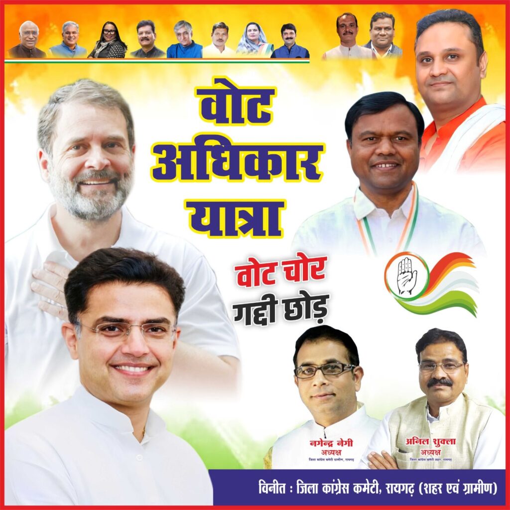 कांग्रेस का वोट अधिकार यात्रा 16 सितंबर को दोपहर 3 बजे रायगढ़ के सत्ती गुड़ी चौक से शुरू होकर घड़ी चौक, हंडी चौक, गद्दी चौक, सुभाष चौक, एसपी ऑफिस के सामने से होकर स्टेशन चौक में सम्पन्न होगी। यात्रा के समापन के बाद कांग्रेस के नेतागण आम सभा को भी संबोधित करेंगे।