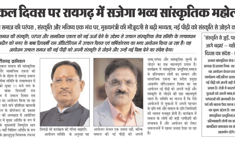 रायगढ़ । रायगढ उत्कल सांस्कृतिक सेवा समिति के तत्वावधान में 1 अप्रैल को सुबह 11 बजे नगर के बाबा प्रियदर्शी राम ऑडिटोरियम में उत्कल दिवस एवं वार्षिकोत्सव का आयोजन किया जा रहा है। डॉ. प्रकाश मिश्रा की अध्यक्षता में आयोजित इस कार्यक्रम में मुख्य अतिथि के रूप में छत्तीसगढ़ के मुख्यमंत्री विष्णुदेव साय शामिल होंगे। वहीं विशिष्ट अतिथि के रूप में ओडिशा के झारसुगुड़ा विधायक टंकधर त्रिपाठी भी कार्यक्रम की गरिमा बढ़ाएंगे। संस्कृति दिवस पर उत्कल समाज की परंपरा , संस्कृति और भविष्य एक मंच पर संगम होगा।